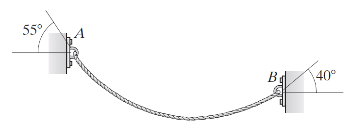 3.5 Una pesada cuerda que se usa como amarradero para un barco crucero se cuelga en la forma mostrada. Si la masa de la cuerda es 90 kg, ¿cuáles son las tensiones en la cuerda en A y B?