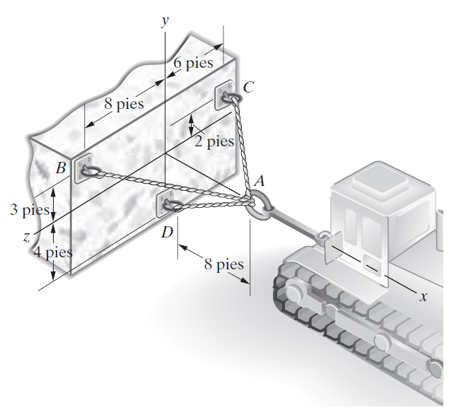 3.67 El tractor de la figura ejerce una fuerza F = 2i (kip) en A. ¿Cuáles son las tensiones en las cables AB, AC y AD?